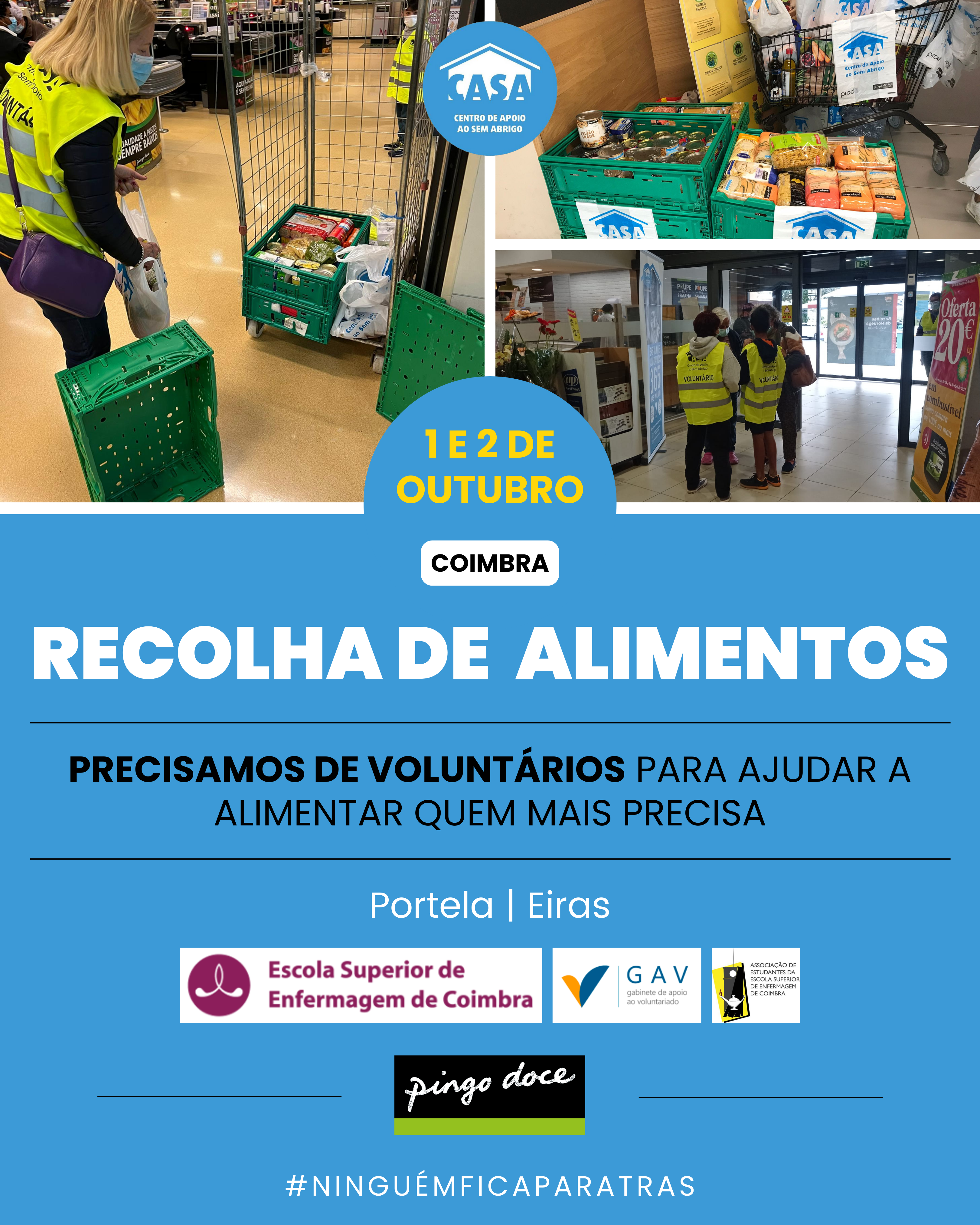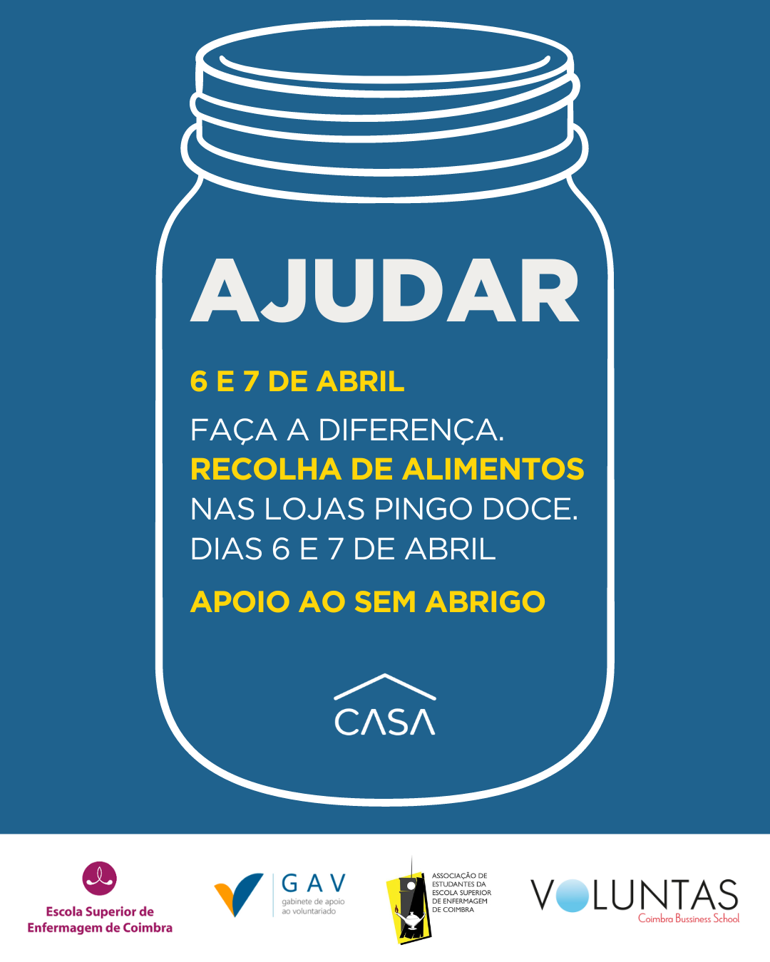 O Gabinete de Voluntariado da ESEnfC, divulga a nova campanha de recolha de alimentos para o Centro de Apoio ao Sem Abrigo (CASA), nos dias 1 e 2 de abril de 2023. Contudo, para que esta se realize é necessário a colaboração de voluntários