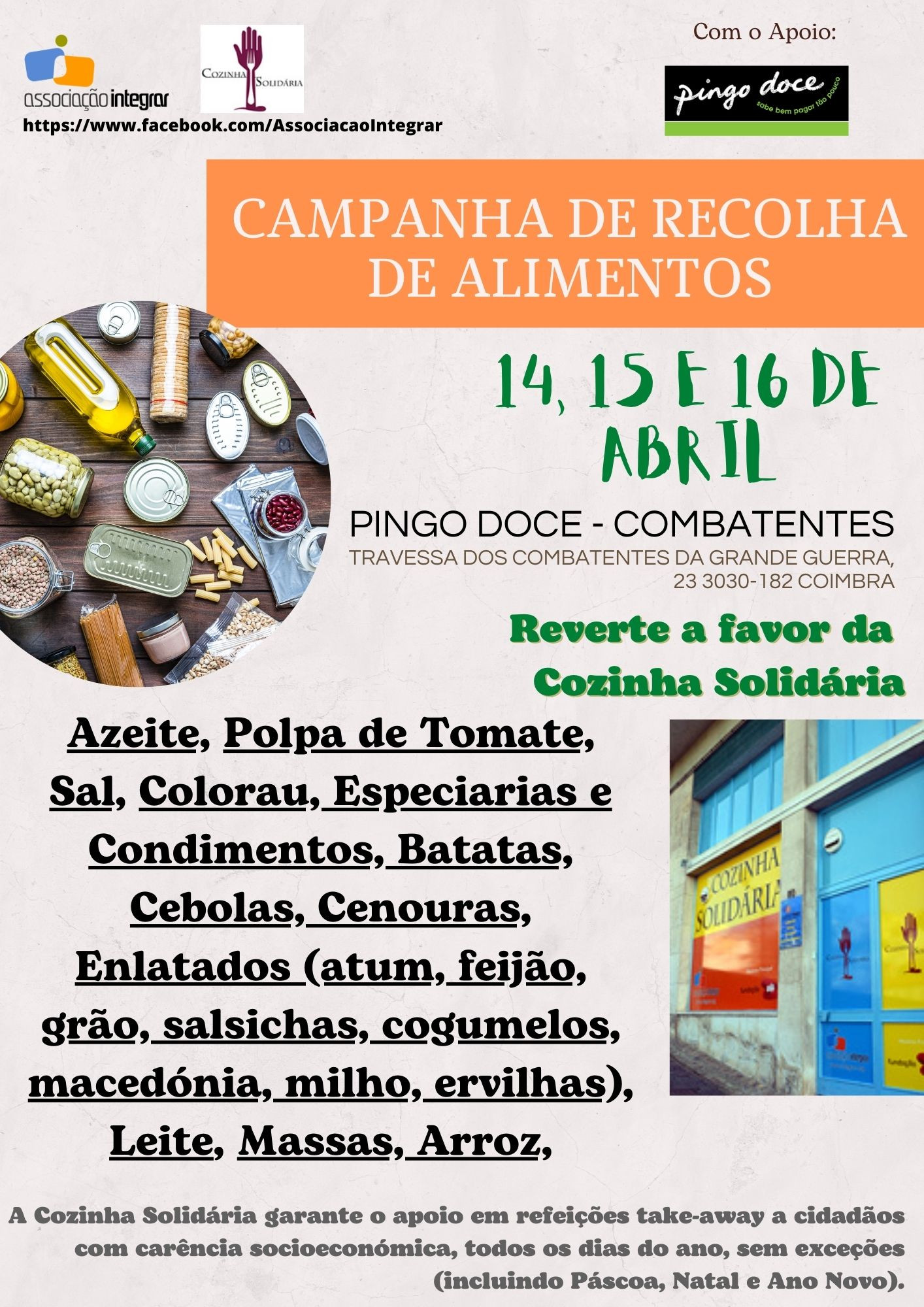 O Gabinete de Voluntariado da ESEnfC, divulga a nova campanha de recolha de alimentos, da Associação Integrar em parceria com o Pingo Doce dos Combatentes, que se realizará nos próximos dias 14, 15 e 16 de abril de 2023, e irá reverter a favor da Cozinha Solidária.
