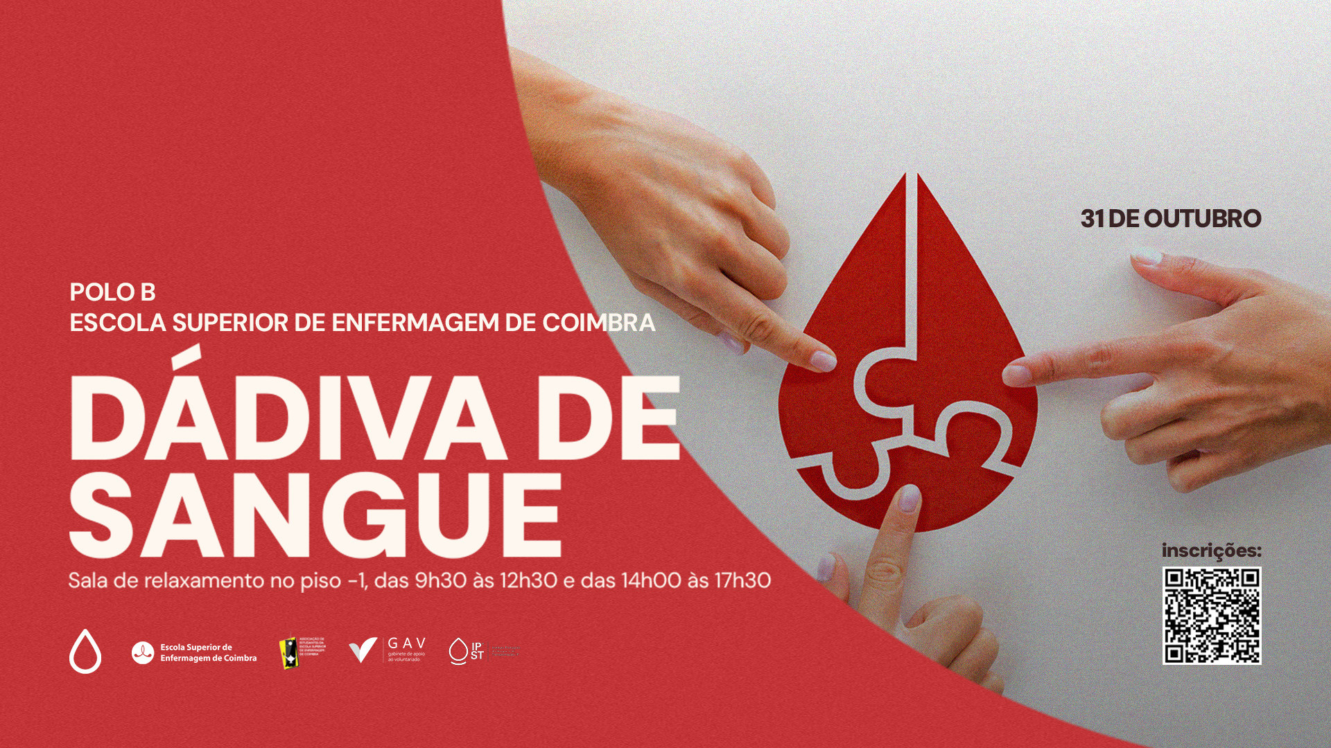 No âmbito da valência de promoção da saúde escolar, juntamente com o IPST, estão a organizar uma dádiva de sangue, dia 31 de outubro, na Sala de Relaxamento do Polo B da Escola Superior de Enfermagem de Coimbra.