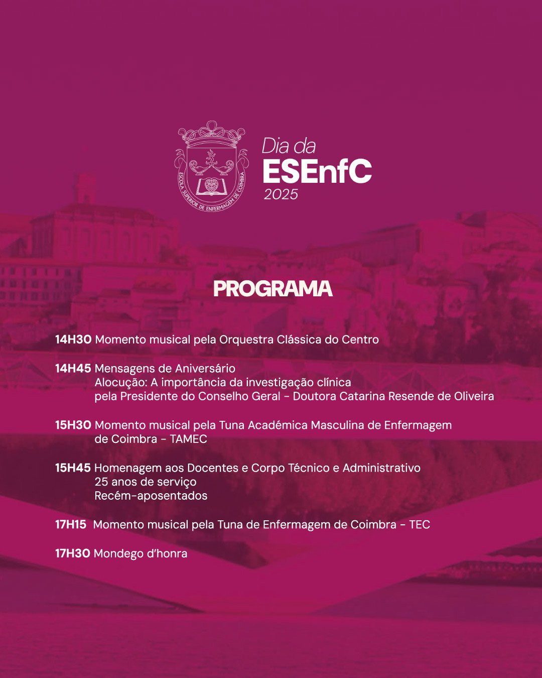 Além do momento mais solene – com as mensagens de aniversário e uma alocução pela Senhora Presidente do Conselho Geral da Escola, sobre a importância da investigação clínica –, haverá homenagens a docentes e pessoal do corpo técnico e administrativo. E animação pelas tunas de Enfermagem de Coimbra.