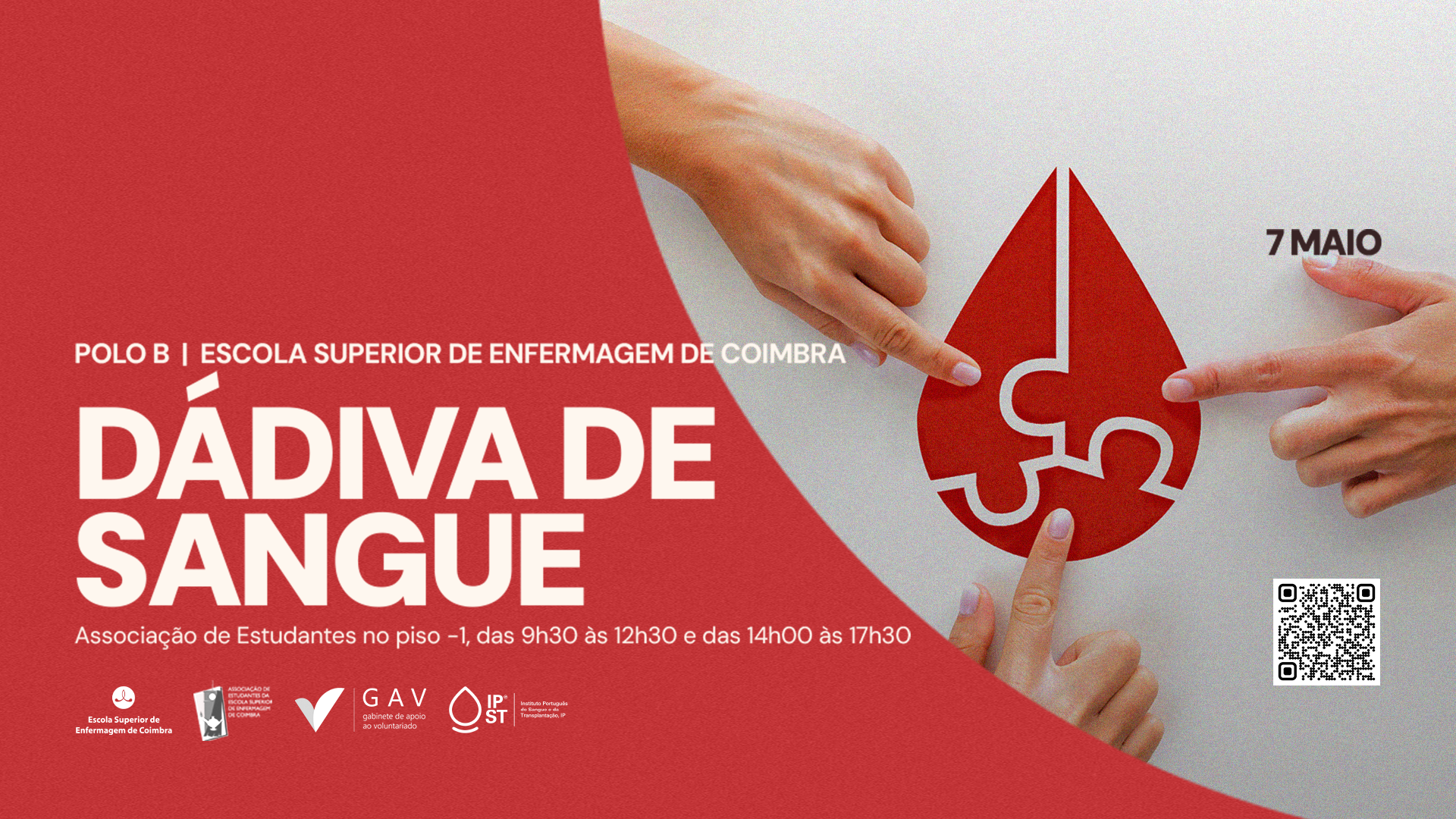 No âmbito da valência de promoção da saúde escolar, juntamente com o IPST, estão a organizar uma dádiva de sangue, dia 7 de maio, na Associação de Estudantes do Polo B da Escola Superior de Enfermagem de Coimbra.